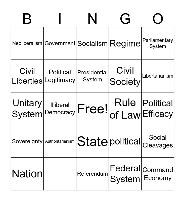 This bingo card has a free space and 24 words: political, Nation, State, Social Cleavages, Government, Regime, Neoliberalism, Socialism, Libertarianism, Authoritarianism, Civil Society, Civil Liberties, Political Rights, Political Efficacy, Political Legitimacy, Federal System, Unitary System, Presidential System, Parliamentary System, Illiberal Democracy, Rule of Law, Sovereignty, Referendum and Command Economy.