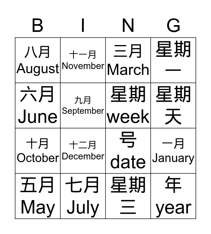 This bingo card has 20 words: 一月 January, 二月 February, 三月 March, 四月 April, 五月 May, 六月 June, 七月 July, 八月 August, 十月 October, 十一月 November, 十二月 December, 号 date, 九月 September, 年 year, 星期 week, 今天 today, 星期天, 星期一, 星期三 and 星期六.