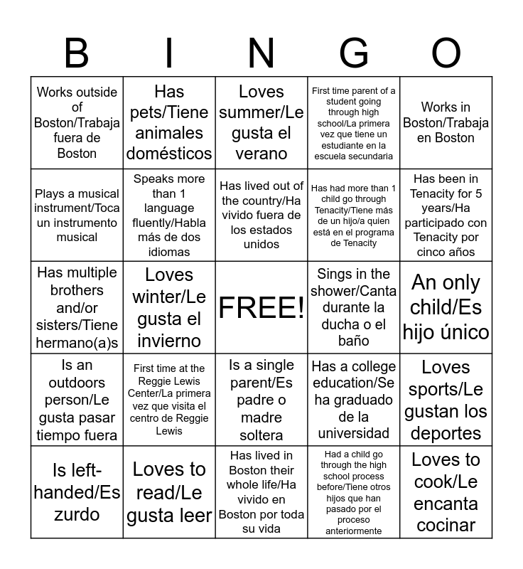 This bingo card has a free space and 24 words: First time at the Reggie Lewis Center/La primera vez que visita el centro de Reggie Lewis, Loves to read/Le gusta leer, Has lived out of the country/Ha vivido fuera de los estados unidos, Is left-handed/Es zurdo, Works in Boston/Trabaja en Boston, Works outside of Boston/Trabaja fuera de Boston, Plays a musical instrument/Toca un instrumento musical, Has pets/Tiene animales domésticos, Sings in the shower/Canta durante la ducha o el baño, Is a single parent/Es padre o madre soltera, Has had more than 1 child go through Tenacity/Tiene más de un hijo/a quien está en el programa de Tenacity, Has multiple brothers and/or sisters/Tiene hermano(a)s, Has a college education/Se ha graduado de la universidad, Loves sports/Le gustan los deportes, Speaks more than 1 language fluently/Habla más de dos idiomas, Had a child go through the high school process before/Tiene otros hijos que han pasado por el proceso anteriormente, An only child/Es hijo único, Loves summer/Le gusta el verano, Has been in Tenacity for 5 years/Ha participado con Tenacity por cinco años, Loves winter/Le gusta el invierno, Loves to cook/Le encanta cocinar, Is an outdoors person/Le gusta pasar tiempo fuera, First time parent of a student going through high school/La primera vez que tiene un estudiante en la escuela secundaria and Has lived in Boston their whole life/Ha vivido en Boston por toda su vida.