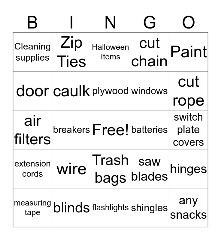 This bingo card has a free space and 24 words: wire, blinds, plywood, measuring tape, Paint, Cleaning supplies, door, Zip Ties, batteries, Trash bags, windows, air filters, saw blades, hinges, caulk, shingles, switch plate covers, Halloween Items, cut rope, breakers, any snacks, extension cords, cut chain and flashlights.