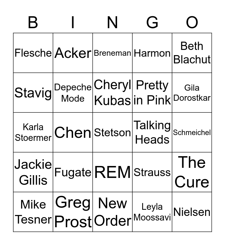This bingo card has a free space and 34 words: Madonna, Leyla Moossavi, Grossman, Bosker, Jackie Gillis, Depeche Mode, Beth Blachut, Mike Tesner, Acker, Violent Femmes, Cheryl Kubas, Breneman, Laura Mazzola, Breakfast Club, Talking Heads, Gila Dorostkar, Greg Prost, Karla Stoermer, Fugate, Strauss, REM, Kris Matasich, Flesche, Schmeichel, New Order, Nielsen, Harmon, Ike Pulver, Pretty in Pink, Stavig, Lisa Phelps, Chen, The Cure and Devo.
