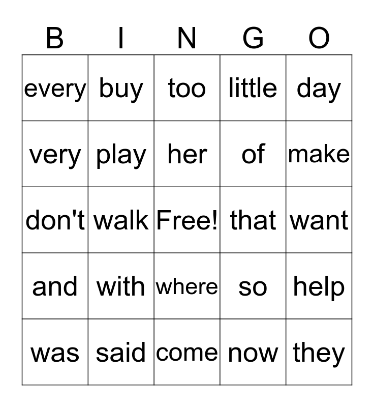 This bingo card has a free space and 24 words: with, said, her, was, day, every, very, buy, that, where, of, don't, so, help, play, now, want, too, make, walk, they, and, little and come.