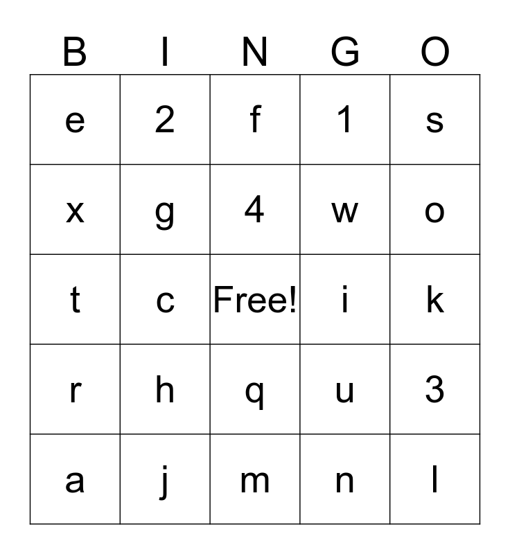 This bingo card has a free space and 29 words: a, b, c, d, e, f, g, h, i, j, k, l, m, n, o, p, q, r, s, t, u, v, w, x, 1, 2, 3, 4 and 5.
