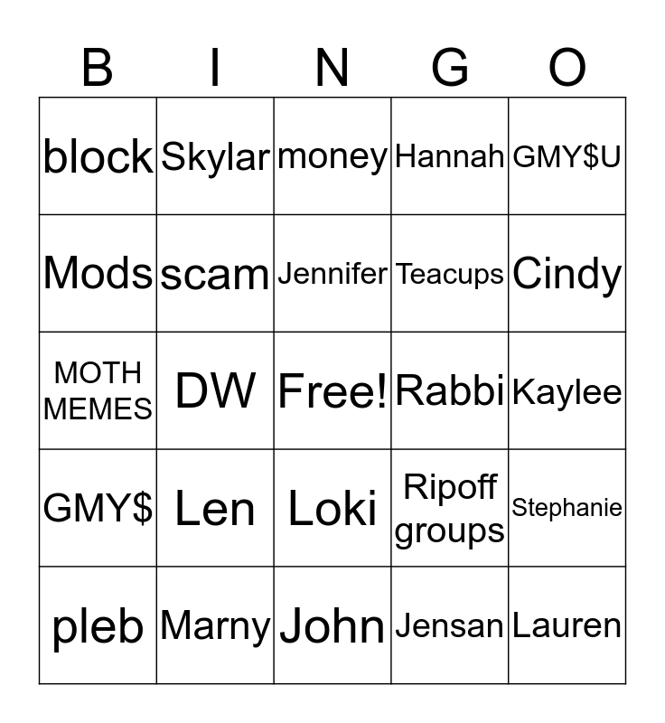 This bingo card has a free space and 29 words: pleb, lux, DW, ban, block, money, scam, Len, Rabbi, Marny, Kaylee, Lauren, John, Jensan, Cindy, Drew, Loki, GMY$, GMY$U, MOTH MEMES, Ripoff groups, Hands, Teacups, Mods, Hannah, Skylar, Stephanie, Jennifer and Meme.