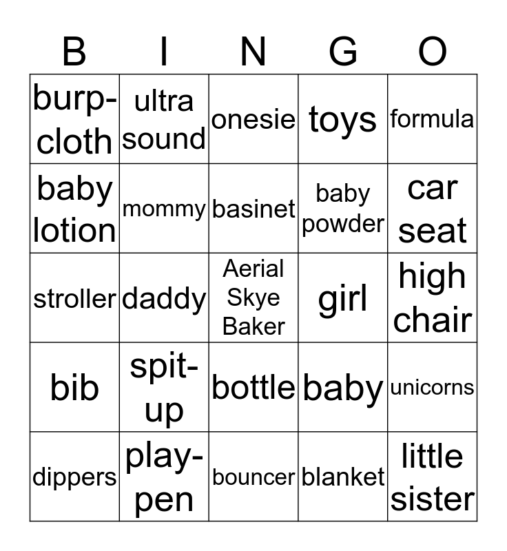 This bingo card has a free space and 29 words: dippers, milk, daddy, gas, burp-cloth, onesie, mommy, spit-up, girl, play-pen, high chair, little sister, bouncer, blanket, car seat, booties, bottle, bib, formula, stroller, baby, baby food, baby powder, baby lotion, toys, ultra sound, unicorns, basinet and love.
