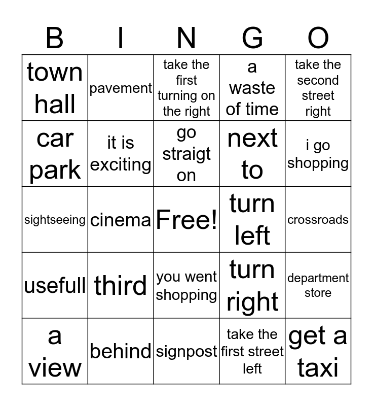 This bingo card has a free space and 34 words: it is tall, take the first street left, it goes very fast, corner, usefull, it is exciting, take the second street right, a view, pavement, village, go straigt on, take the first turning on the right, swimming pool, in front of, turn left, i go shopping, behind, sightseeing, third, turn right, you went shopping, church, town hall, crossroads, signpost, get a taxi, a waste of time, city centre, next to, car park, near, cinema, department store and trip.
