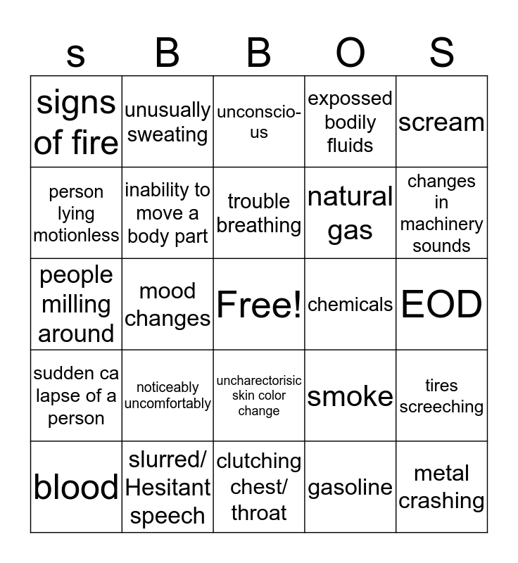 This bingo card has a free space and 24 words: blood, noticeably uncomfortably, trouble breathing, gasoline, scream, signs of fire, unusually sweating, unconscio-us, chemicals, EOD, people milling around, inability to move a body part, smoke, tires screeching, person lying motionless, slurred/ Hesitant speech, clutching chest/ throat, expossed bodily fluids, changes in machinery sounds, sudden ca lapse of a person, mood changes, uncharectorisic skin color change, natural gas and metal crashing.