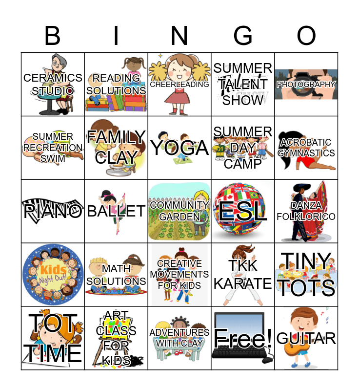 This bingo card has 30 images and 29 words: ART CLASS FOR KIDS, AFTER SCHOOL ADVENTURES, BALLET, BUDDY WORKOUT, CERAMICS STUDIO, CHEERLEADING, FAMILY CLAY, CREATIVE MOVEMENTS FOR KIDS, ESL, ADVENTURES WITH CLAY, DANZA FOLKLORICO, COMMUNITY GARDEN, Free!, GUITAR, ACROBATIC GYMNASTICS, HIP HOP, TKK KARATE, MATH SOLUTIONS, PHOTOGRAPHY, PIANO, PILATES, READING SOLUTIONS, SUMMER DAY CAMP, SUMMER RECREATION SWIM, SUMMER TALENT SHOW, TINY TOTS, TOT TIME, YOGA and ZUMBA CLASSES.
