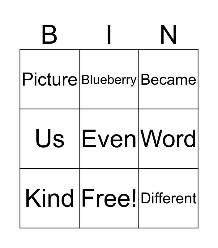 This bingo card has a free space and 8 words: Word, Became, Blueberry, Kind, Picture, Different, Us and Free!.