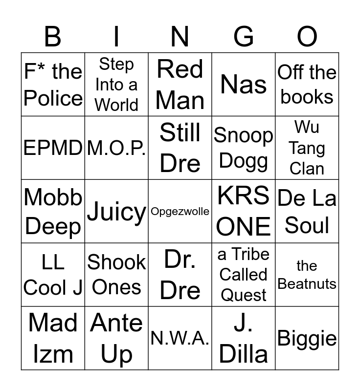 This bingo card has a free space and 24 words: Shook Ones, Ante Up, Still Dre, Mad Izm, Off the books, F* the Police, EPMD, Step Into a World, KRS ONE, Dr. Dre, Snoop Dogg, Mobb Deep, a Tribe Called Quest, the Beatnuts, M.O.P., J. Dilla, De La Soul, Red Man, Wu Tang Clan, Juicy, Biggie, LL Cool J, Nas and N.W.A..