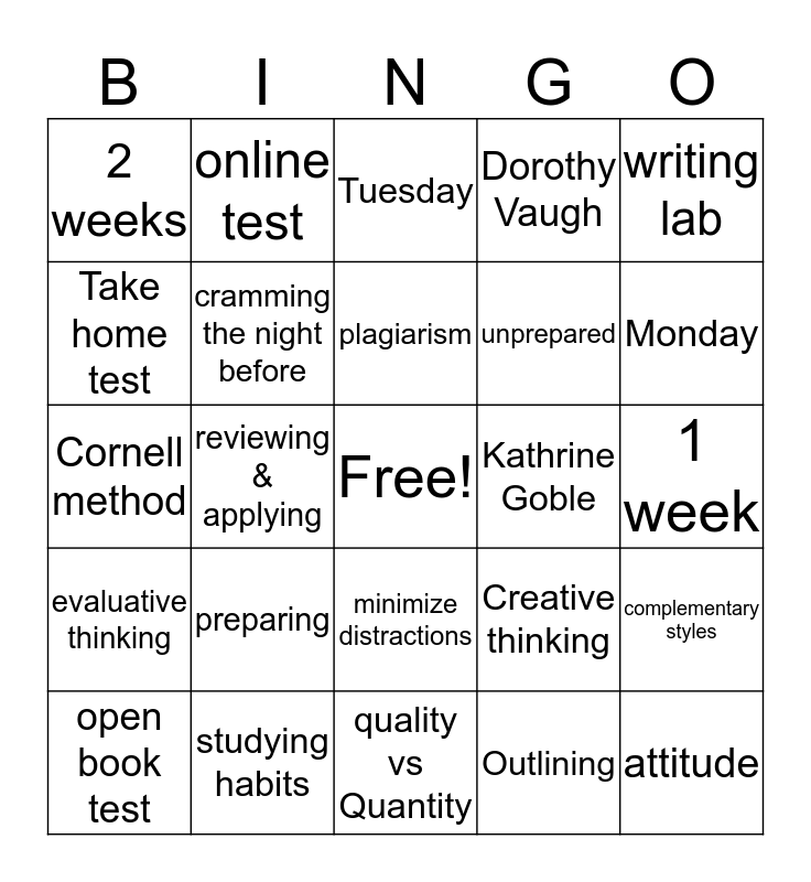 This bingo card has a free space and 24 words: preparing, studying habits, plagiarism, open book test, writing lab, 2 weeks, Take home test, online test, Kathrine Goble, minimize distractions, unprepared, Cornell method, Creative thinking, complementary styles, cramming the night before, Outlining, 1 week, Tuesday, Monday, reviewing & applying, attitude, evaluative thinking, Dorothy Vaugh and quality vs Quantity.