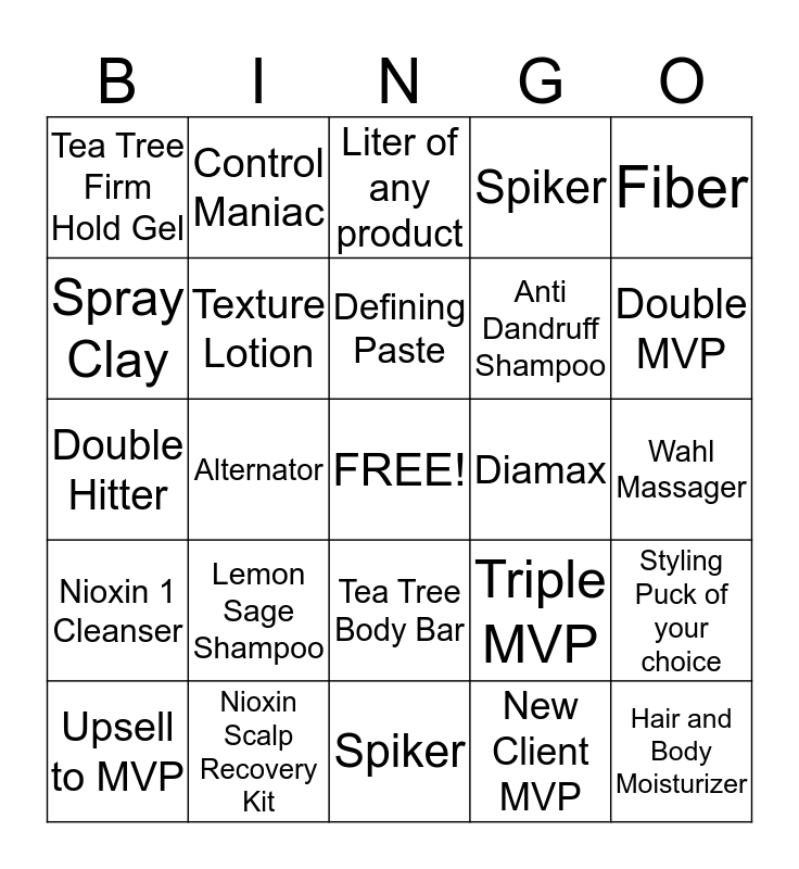 This bingo card has a free space and 24 words: Lemon Sage Shampoo, Nioxin Scalp Recovery Kit, Defining Paste, Upsell to MVP, Fiber, Tea Tree Firm Hold Gel, Spray Clay, Control Maniac, Diamax, Tea Tree Body Bar, Anti Dandruff Shampoo, Double Hitter, Triple MVP, Styling Puck of your choice, Texture Lotion, New Client MVP, Wahl Massager, Liter of any product, Double MVP, Alternator, Hair and Body Moisturizer, Nioxin 1 Cleanser, Spiker and Spiker.