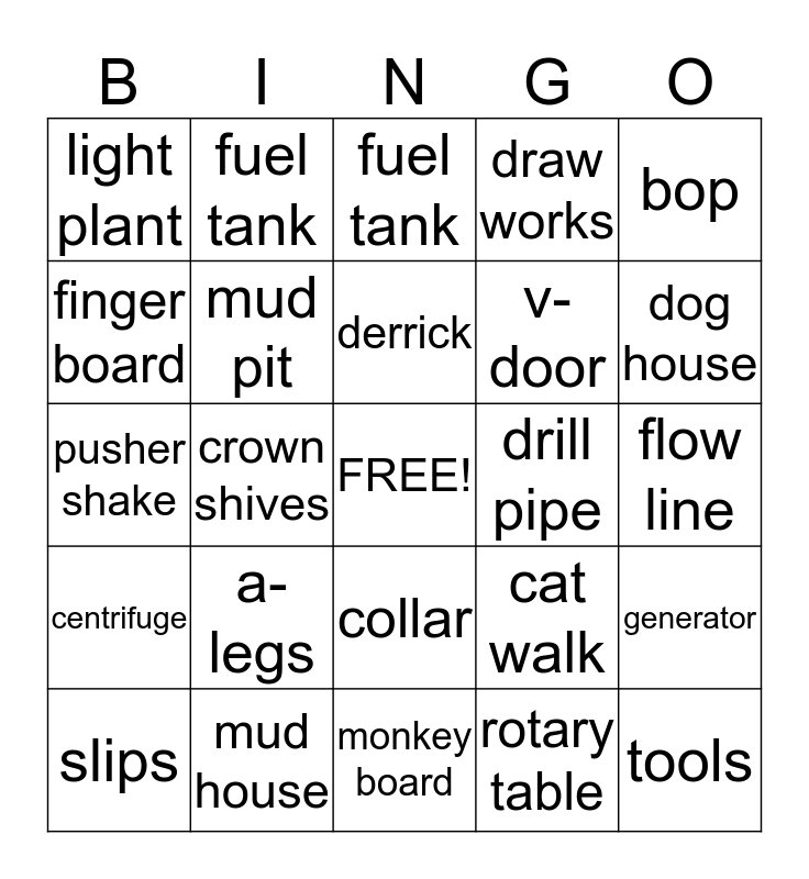 This bingo card has a free space and 24 words: a-legs, mud house, derrick, slips, bop, light plant, finger board, fuel tank, drill pipe, collar, v-door, pusher shake, cat walk, generator, mud pit, rotary table, flow line, fuel tank, dog house, crown shives, tools, centrifuge, draw works and monkey board.