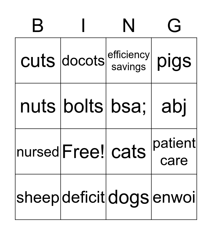 This bingo card has 16 words: deficit, patient care, efficiency savings, cuts, nursed, docots, cats, dogs, nuts, bolts, sheep, pigs, Free!, abj, bsa; and enwoi.
