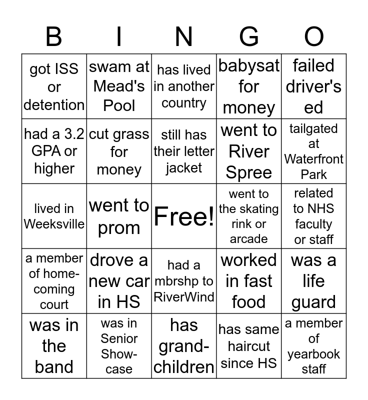 This bingo card has a free space and 24 words: drove a new car in HS, was in Senior Show-case, still has their letter jacket, was in the band, failed driver's ed, got ISS or detention, had a 3.2 GPA or higher, swam at Mead's Pool, went to the skating rink or arcade, had a mbrshp to RiverWind, went to River Spree, lived in Weeksville, worked in fast food, was a life guard, cut grass for money, has same haircut since HS, related to NHS faculty or staff, has lived in another country, tailgated at Waterfront Park, went to prom, a member of yearbook staff, a member of home-coming court, babysat for money and has grand-children.