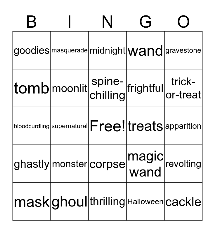 This bingo card has a free space and 173 words: Afraid, afterlife, autumn, alarming, apparition, bogeyman, bat, bone, beast, blood, boo, bizarre, bloodcurdling, broomstick, cackle, cauldron, corpse, cadaver, cemetery, costume, candy, chilling, cape, cloak, carve, creepy, casket, cobweb, cat, coffin, crypt, dark, demon, dreadful, darkness, devil, dress-up, dead, devilish, death, disguise, eerie, enchant, eyeballs, evil, eyepatch, face paint, fear, frighten, frightening, fall, flashlight, frightful, fangs, fog, fantasy, fright, genie, goblin, grim, ghastly, goodies, Grim Reaper, ghost, gory, grisly, ghostly, gown, gruesome, ghoul, grave, ghoulish, gravestone, hair-raising, haunted house, hocus pocus, Halloween, hayride, horrible, hat, headstone, horrify, haunt, hobgoblin, howl, jack-o'-lantern, jumpsuit, lantern, macabre, masquerade, moonlight, magic, mausoleum, moonlit, magic wand, midnight, morbid, make-believe, mist, mummy, make-up, monster, mysterious, mask, moon, night, nightmare, October, owl, ogre, otherworldly, party, pitchfork, petrify, poltergeist, phantasm, potion, pumpkin, phantom, prank, pretend, repulsive, RIP, revolting, scare, skull, spooky, scarecrow, startling, scary, strange, scream, spell, shadow, spider, supernatural, shadowy, spider web, superstition, shock, spine-chilling, sweets, shocking, spirit, skeleton, tarantula, treats, terrible, trick, terrify, tomb, trick-or-treat, tombstone, troll, thrilling, treat, unearthly, unnerving, vampire, vanish, wand, werewolf, witchcraft, warlock, wicked, wizard, web, wig, wizardry, weird, witch, wraith and zombie.
