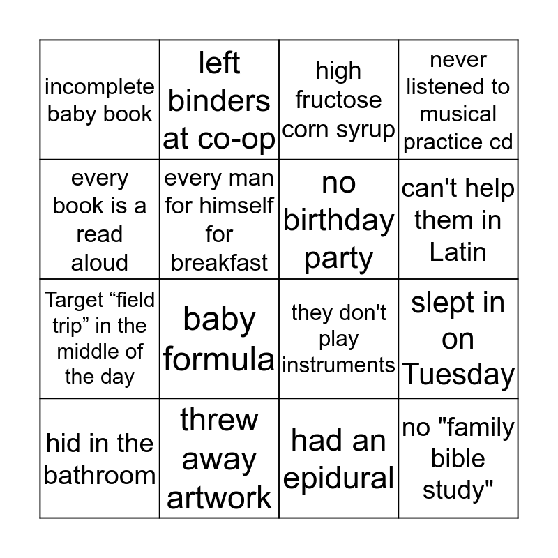 This bingo card has 31 words: Free!, hid sweets from my kids, slept in on Tuesday, used tv as babysitter, incomplete baby book, high fructose corn syrup, no birthday party, pizza for dinner, threw away artwork, math in the summer, had an epidural, hid in the bathroom, school in pajamas, school work on sunday, baby formula, no clue what their allergies are, started science project the week of, homework notice - again, no "family bible study", co-sleeping, every book is a read aloud, they don't know cursive, I researched public school, left binders at co-op, Target “field trip” in the middle of the day, every man for himself for breakfast, never listened to musical practice cd, they don't play instruments, no organic food...ever, can't help them in Latin and junk food in lunchkit.