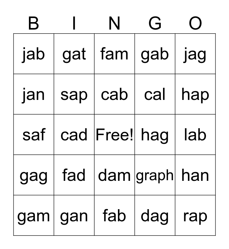 This bingo card has a free space and 39 words: bat, nab, Pam, sap, gam, dam, cab, Mag, jag, gag, cad, gab, rap, lab, hag, fad, ban, jab, gram, graph, jan, fab, cal, hap, rad, lat, jat, bap, dat, gat, nad, cag, fam, gan, dag, rab, han, saf and lan.