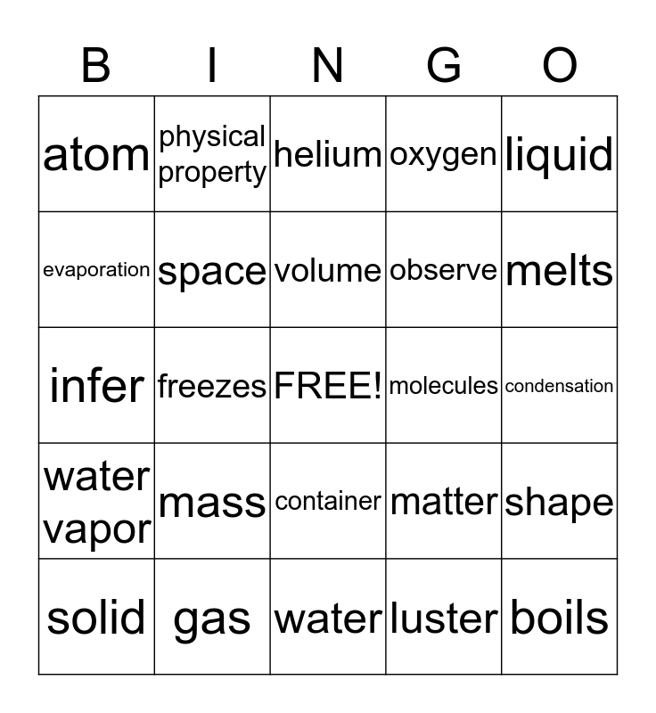 This bingo card has a free space and 24 words: mass, gas, volume, solid, liquid, atom, evaporation, physical property, molecules, container, observe, infer, matter, shape, space, luster, condensation, helium, melts, freezes, boils, water vapor, oxygen and water.