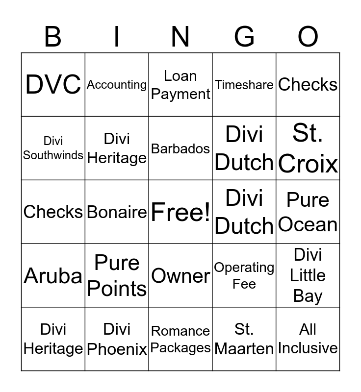 This bingo card has a free space and 48 words: Aruba, Divi Phoenix, Bonaire, Barbados, St. Croix, Pure Ocean, Accounting, Divi Village, Divi Dutch, Divi Flamingo, Divi Southwinds, Divi Heritage, Divi Carina Bay, Divi Little Bay, St. Maarten, All Inclusive, Loan Payment, Operating Fee, Owner, DVC, Pure Points, Romance Packages, Timeshare, Checks, Divi Phoenix, Bonaire, Barbados, St. Croix, Pure Ocean, Aruba, Pure Points, Divi Village, Divi Flamingo, Divi Southwinds, Divi Heritage, Divi Carina Bay, Divi Little Bay, St. Maarten, All Inclusive, Loan Payment, Operating Fee, Owner, Divi Dutch, DVC, Checks, Romance Packages, Timeshare and Accounting.
