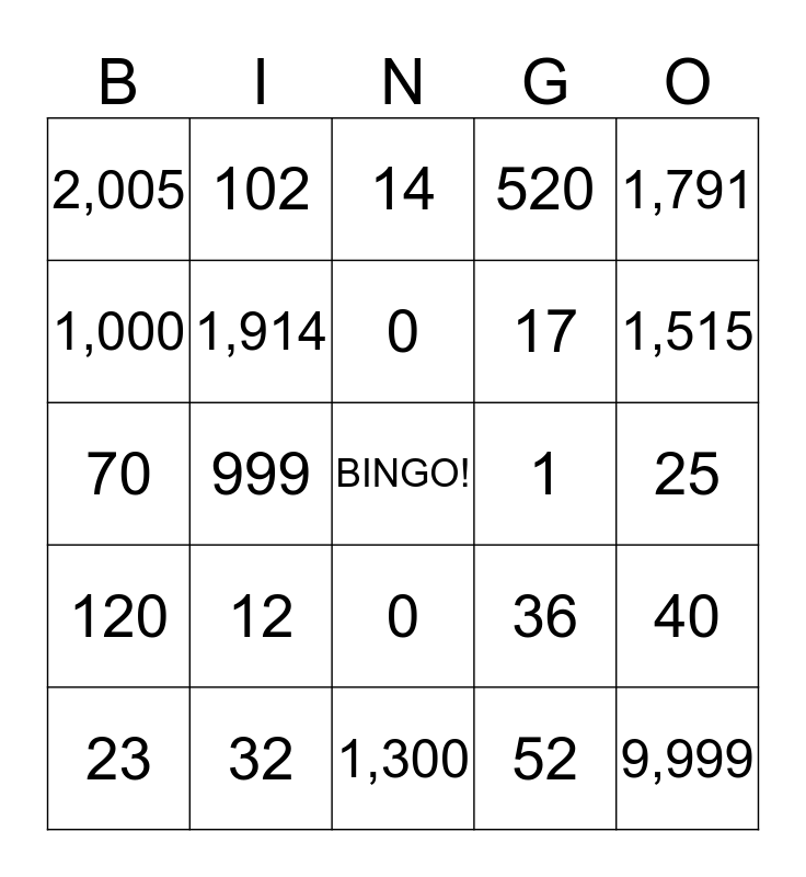 This bingo card has a free space and 24 words: 12, 32, 0, 23, 1,791, 2,005, 1,000, 102, 1, 0, 17, 70, 36, 40, 1,914, 52, 25, 14, 1,515, 999, 9,999, 120, 520 and 1,300.