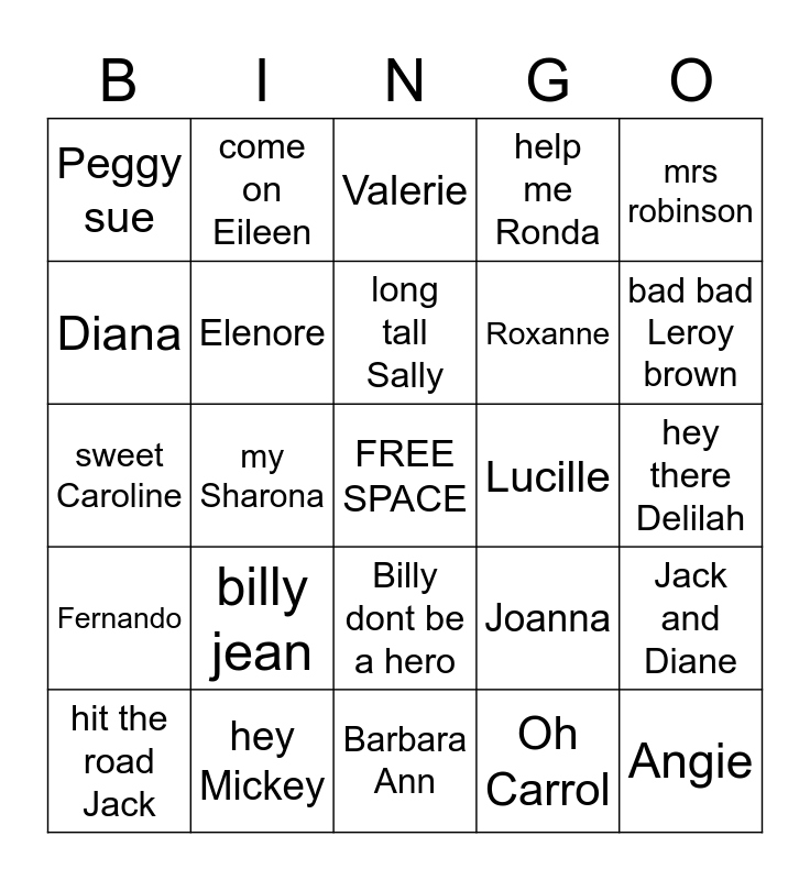 This bingo card has a free space and 46 words: a boy named sue, Angie, Annies song, Barbara Ann, billy jean, Cecilia, come on Eileen, cracklin Rosie, Diana, oh Donna, Elenore, help me Ronda, Jack and Diane, Joanna, Judy in disguise, Layla, long tall Sally, Lucille, Maggie may, mrs robinson, my Sharona, Oh Carrol, Peggy sue, Roxanne, Daniel, bad bad Leroy brown, hit the road Jack, mack the knife, Billy dont be a hero, Fernando, Mr Jones, Johnny b good, Jessies girl, me and julio, major Tom, hey Mickey, hey there Delilah, Kyrie, dirty Diana, Julie, Sandy, Valerie, sweet Caroline, Toms diner, da doo Ron Ron and you can call me Al.