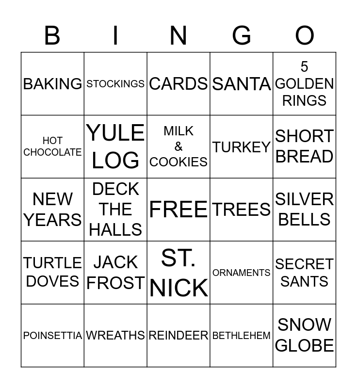 This bingo card has a free space and 24 words: JACK FROST, WREATHS, MILK & COOKIES, POINSETTIA, 5 GOLDEN RINGS, BAKING, HOT CHOCOLATE, STOCKINGS, TREES, ST. NICK, TURKEY, NEW YEARS, ORNAMENTS, SECRET SANTS, YULE LOG, BETHLEHEM, SILVER BELLS, CARDS, SHORT BREAD, DECK THE HALLS, SNOW GLOBE, TURTLE DOVES, SANTA and REINDEER.