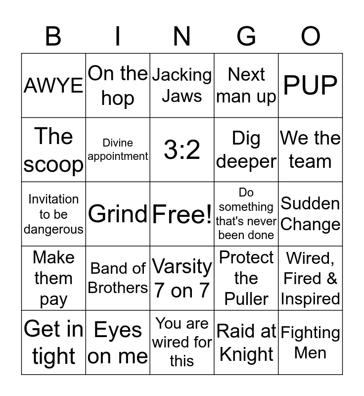 This bingo card has a free space and 42 words: 4:1, 3:2, Red & White, Band of Brothers, Raid at Knight, Wired, Fired & Inspired, Fighting Men, Title Tough, Jacking Jaws, Varsity 7 on 7, Sudden Change, We the team, Grind, PUP, Embrace the suck, Protect the Puller, 2 claps, Invitation to be dangerous, Riverside, On the hop, The scoop, Ahhhhhhhhh, IAGBU, AWYE, Fight at Knight, Success is measured by..., Dig deeper, Persevere, Big Dreams, Blindside, Win your 1 on 1 matchup, Make them pay, Divine appointment, You are wired for this, Take a moment, Get in tight, Eyes on me, Do something that's never been done, Refs Ref Coaches Coach Players play This is the Fairview Way!, Make a wall, Next man up and No cheap yards.