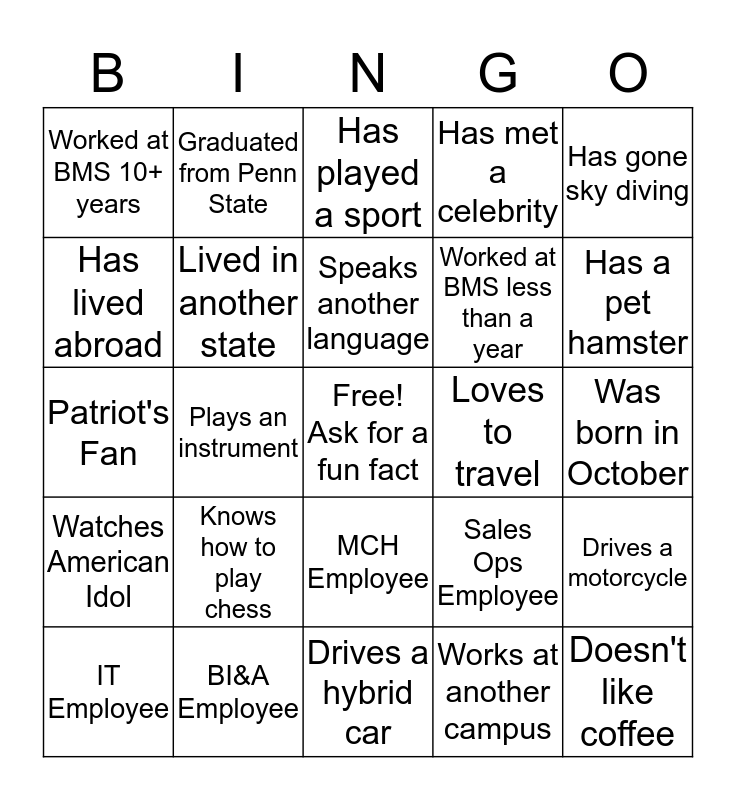 This bingo card has a free space and 24 words: IT Employee, Knows how to play chess, Speaks another language, Works at another campus, Has gone sky diving, Worked at BMS 10+ years, Graduated from Penn State, Has played a sport, Loves to travel, Was born in October, Patriot's Fan, Lived in another state, Sales Ops Employee, Drives a motorcycle, Has lived abroad, BI&A Employee, Drives a hybrid car, Has met a celebrity, Has a pet hamster, Watches American Idol, Plays an instrument, MCH Employee, Worked at BMS less than a year and Doesn't like coffee.