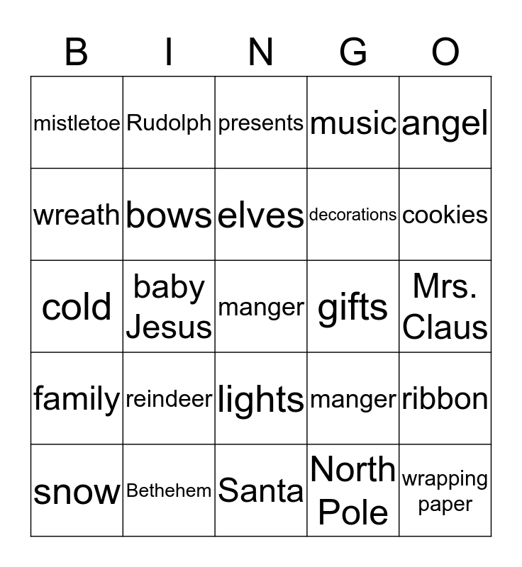 This bingo card has 25 words: reindeer, Santa, elves, snow, angel, mistletoe, wreath, Rudolph, gifts, lights, decorations, cold, manger, ribbon, bows, wrapping paper, Mrs. Claus, presents, cookies, baby Jesus, manger, Bethehem, family, music and North Pole.