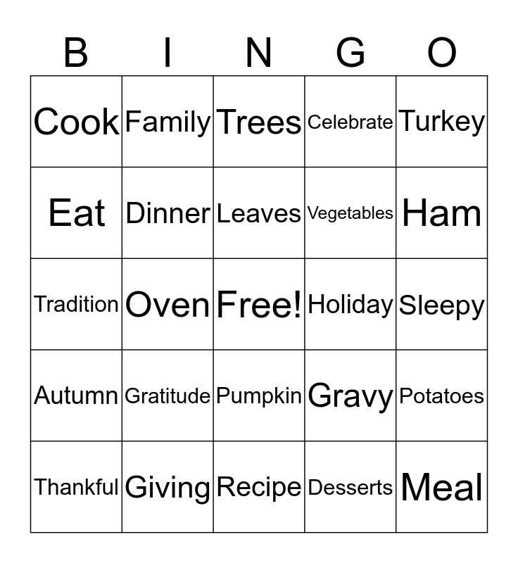 This bingo card has a free space and 34 words: Bake, Desserts, Pie, October, Autumn, Dinner, Turkey, Thankful, Family, Friends, Leaves, Trees, Fall, Laughter, Holiday, Ham, Giving, Tradition, Gratitude, Gravy, Pumpkin, Blessings, Cook, Sleepy, Recipe, Meal, Celebrate, Napkins, Vegetables, Eat, Home, Oven, Potatoes and Full.