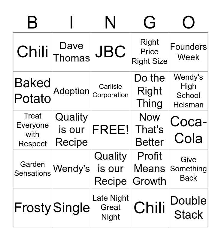 This bingo card has a free space and 24 words: Wendy's, Single, Carlisle Corporation, Frosty, Founders Week, Chili, Baked Potato, Dave Thomas, Now That's Better, Quality is our Recipe, Do the Right Thing, Treat Everyone with Respect, Profit Means Growth, Give Something Back, Adoption, Chili, Coca-Cola, JBC, Wendy's High School Heisman, Quality is our Recipe, Double Stack, Garden Sensations, Right Price Right Size and Late Night Great Night.