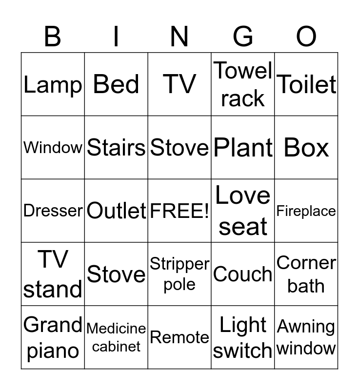 This bingo card has a free space and 24 words: Stove, Medicine cabinet, Stove, Grand piano, Toilet, Lamp, Window, Bed, Love seat, Stripper pole, Plant, Dresser, Couch, Corner bath, Stairs, Light switch, Fireplace, TV, Box, Outlet, Awning window, TV stand, Towel rack and Remote.