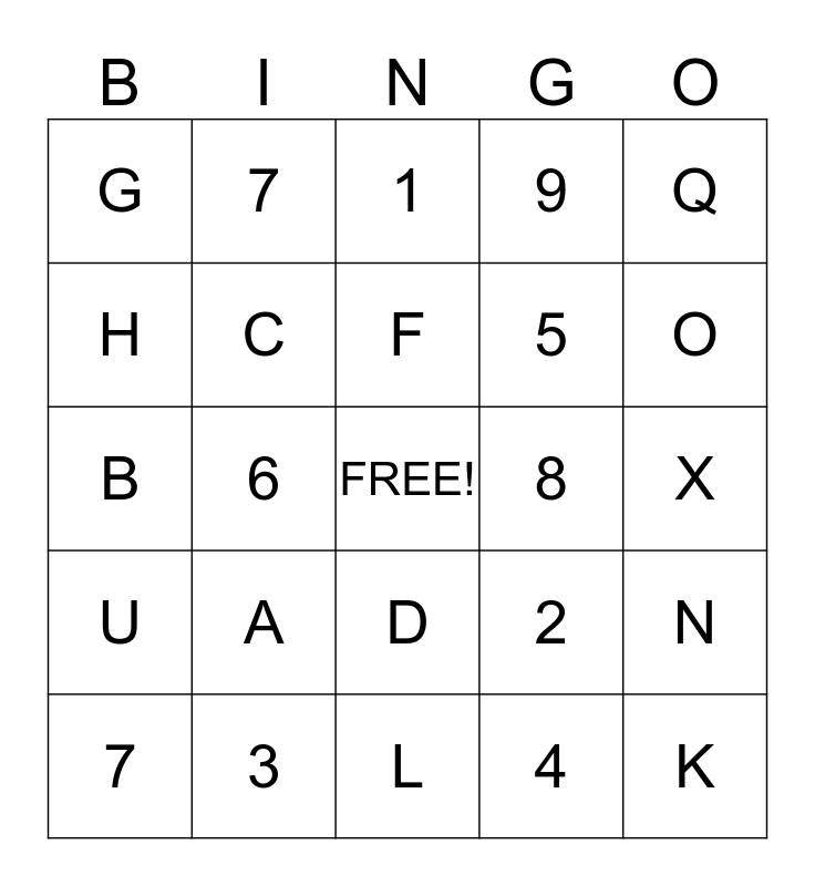 This bingo card has a free space and 24 words: A, 3, F, 7, Q, G, H, 7, 8, D, 5, B, 2, N, C, 4, X, 1, O, 6, K, U, 9 and L.