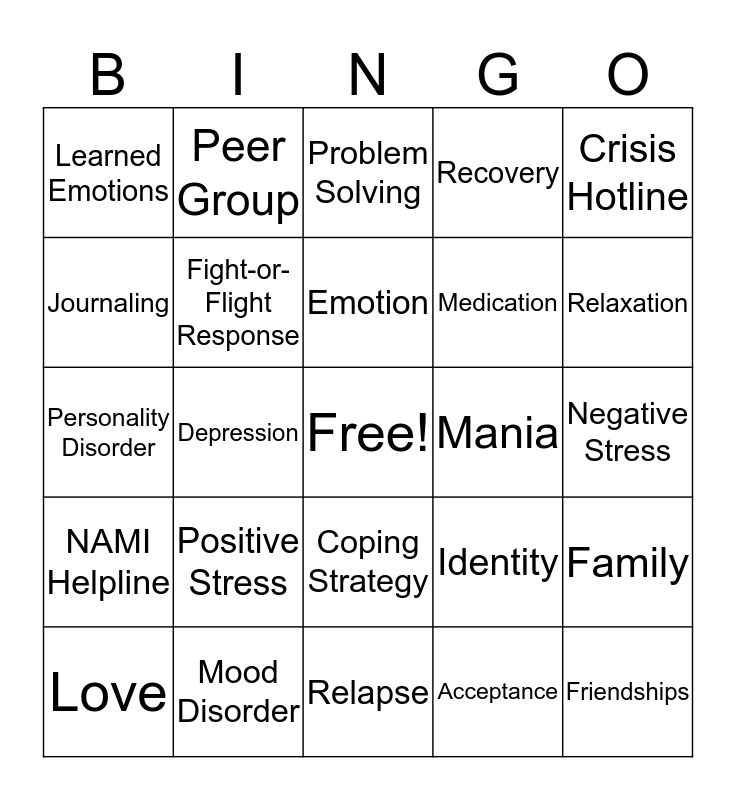 This bingo card has a free space and 29 words: Love, Eating Disorder, Depression, Identity, Learned Emotions, Problem Solving, Fight-or-Flight Response, Positive Stress, Mania, Mood Disorder, Negative Stress, Friendships, Relapse, Acceptance, Relaxation, Bipolar Disorder, Coping Strategy, NAMI Helpline, Crisis Hotline, Personality Disorder, Identity, Mania, Medication, Journaling, Recovery, Peer Group, Family, Emotion and Wellness Goals.