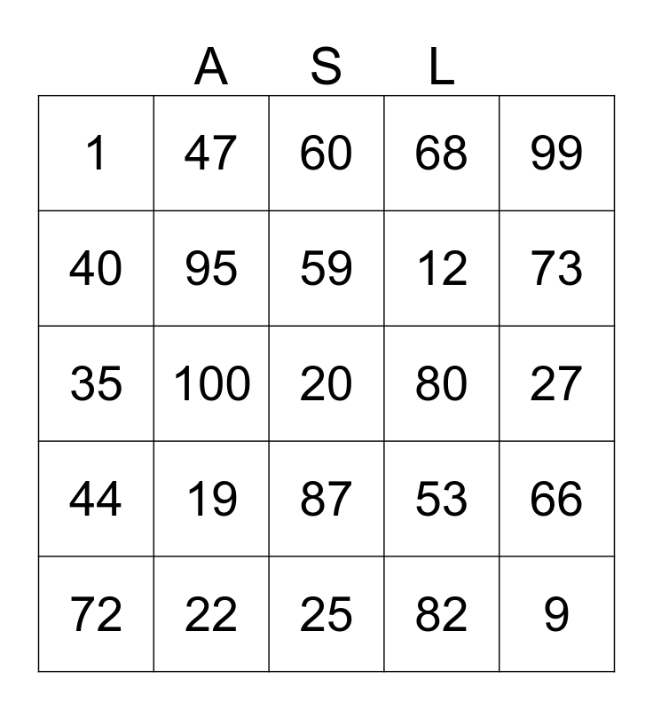 This bingo card has 25 words: 19, 25, 59, 72, 99, 1, 40, 47, 80, 87, 12, 35, 53, 66, 95, 9, 27, 60, 73, 100, 20, 22, 44, 68 and 82.
