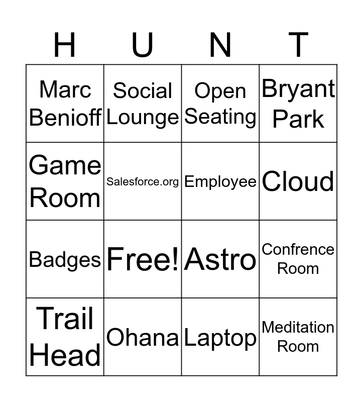 This bingo card has 16 words: Ohana, Confrence Room, Open Seating, Marc Benioff, Badges, Social Lounge, Astro, Laptop, Game Room, Salesforce.org, Trail Head, Bryant Park, Free!, Cloud, Employee and Meditation Room.