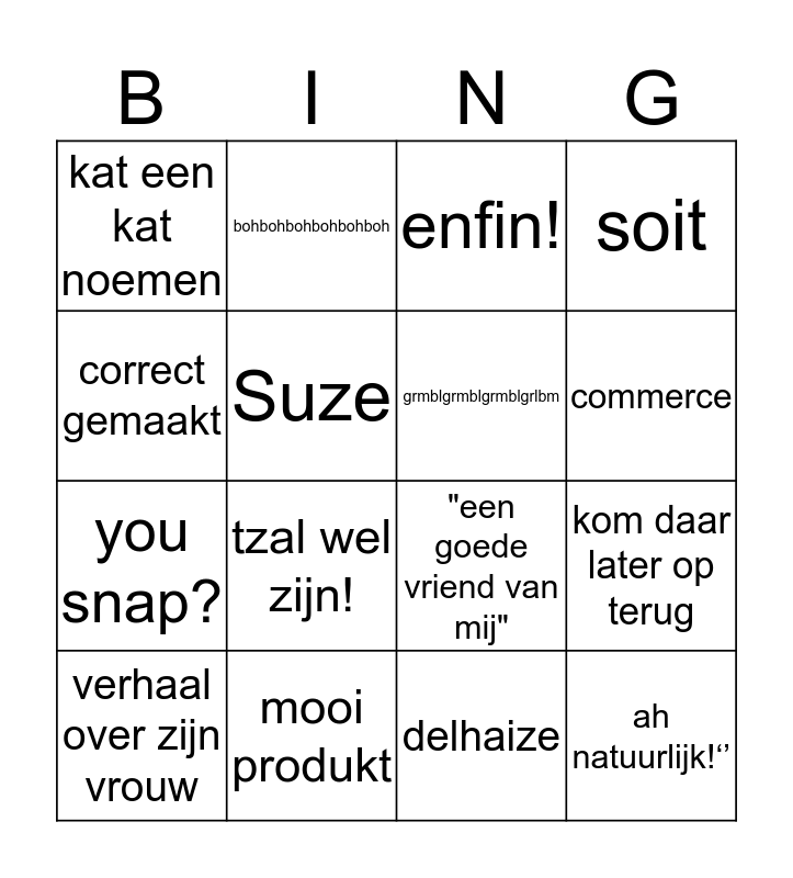 This bingo card has 16 words: mooi produkt, kom daar later op terug, enfin!, kat een kat noemen, you snap?, bohbohbohbohbohboh, "een goede vriend van mij", delhaize, correct gemaakt, Suze, verhaal over zijn vrouw, soit, tzal wel zijn!, commerce, grmblgrmblgrmblgrlbm and ah natuurlijk!‘’.
