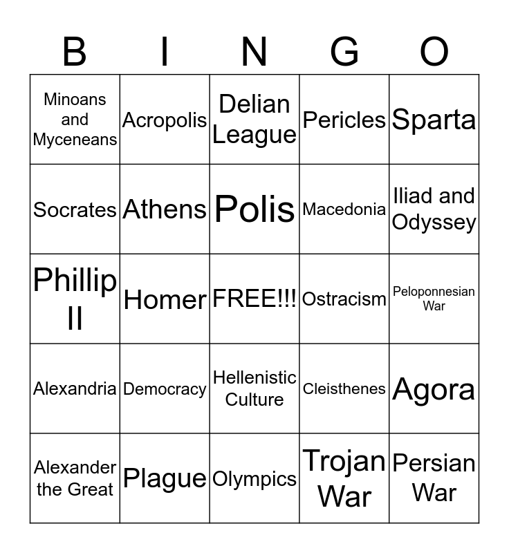 This bingo card has a free space and 24 words: Democracy, Plague, Polis, Alexander the Great, Sparta, Minoans and Myceneans, Socrates, Acropolis, Ostracism, Hellenistic Culture, Macedonia, Phillip II, Cleisthenes, Agora, Athens, Trojan War, Peloponnesian War, Delian League, Iliad and Odyssey, Homer, Persian War, Alexandria, Pericles and Olympics.