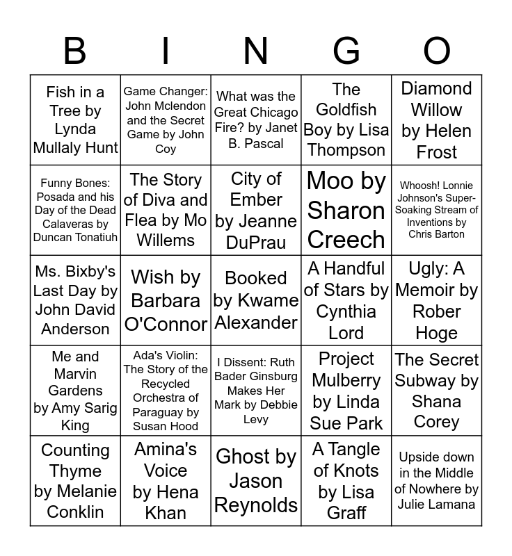 This bingo card has a free space and 24 words: Ada's Violin: The Story of the Recycled Orchestra of Paraguay by Susan Hood, Amina's Voice by Hena Khan, City of Ember by Jeanne DuPrau, Counting Thyme by Melanie Conklin, Diamond Willow by Helen Frost, Fish in a Tree by Lynda Mullaly Hunt, Funny Bones: Posada and his Day of the Dead Calaveras by Duncan Tonatiuh, Game Changer: John Mclendon and the Secret Game by John Coy, A Handful of Stars by Cynthia Lord, I Dissent: Ruth Bader Ginsburg Makes Her Mark by Debbie Levy, Moo by Sharon Creech, Ms. Bixby's Last Day by John David Anderson, Project Mulberry by Linda Sue Park, The Secret Subway by Shana Corey, The Story of Diva and Flea by Mo Willems, A Tangle of Knots by Lisa Graff, Ugly: A Memoir by Rober Hoge, What was the Great Chicago Fire? by Janet B. Pascal, Whoosh! Lonnie Johnson's Super-Soaking Stream of Inventions by Chris Barton, Wish by Barbara O'Connor, Upside down in the Middle of Nowhere by Julie Lamana, Me and Marvin Gardens by Amy Sarig King, The Goldfish Boy by Lisa Thompson and Ghost by Jason Reynolds.