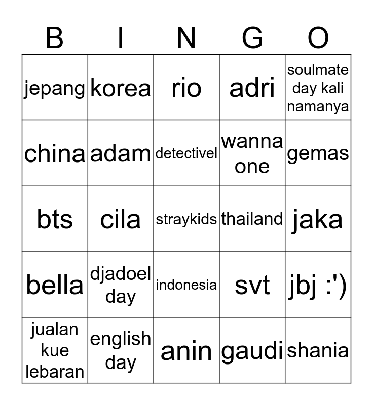 This bingo card has a free space and 24 words: djadoel day, english day, detectivel, jualan kue lebaran, soulmate day kali namanya, jepang, china, korea, thailand, indonesia, wanna one, bts, svt, jbj :'), adam, gaudi, jaka, rio, gemas, cila, shania, bella, adri and anin.