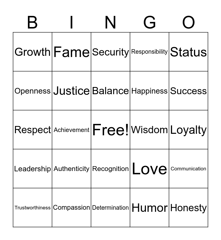 This bingo card has a free space and 24 words: Authenticity, Compassion, Balance, Trustworthiness, Status, Growth, Openness, Fame, Wisdom, Recognition, Happiness, Respect, Love, Communication, Justice, Humor, Loyalty, Security, Success, Achievement, Honesty, Leadership, Responsibility and Determination.