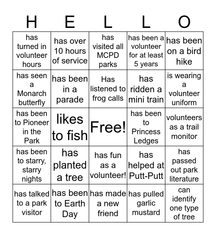 This bingo card has a free space and 24 words: has planted a tree, has been to Earth Day, Has listened to frog calls, has talked to a park visitor, has been on a bird hike, has turned in volunteer hours, has seen a Monarch butterfly, has over 10 hours of service, has been to Princess Ledges, has fun as a volunteer!, has ridden a mini train, has been to Pioneer in the Park, has helped at Putt-Putt, has passed out park literature, has been in a parade, has pulled garlic mustard, volunteers as a trail monitor, has visited all MCPD parks, is wearing a volunteer uniform, likes to fish, can identify one type of tree, has been to starry, starry nights, has been a volunteer for at least 5 years and has made a new friend.