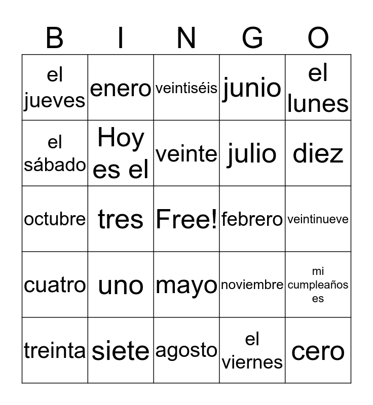 This bingo card has a free space and 24 words: uno, siete, veinte, treinta, el lunes, el jueves, el sábado, enero, febrero, mayo, julio, octubre, noviembre, mi cumpleaños es, Hoy es el, el viernes, veintinueve, veintiséis, diez, tres, cero, cuatro, junio and agosto.