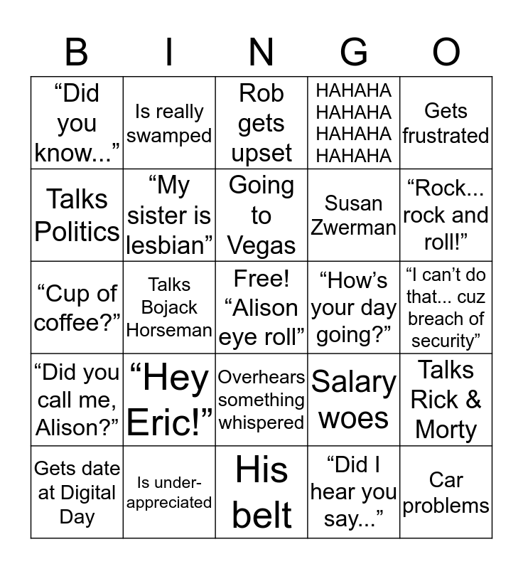 This bingo card has a free space and 24 words: “Hey Eric!”, Is under- appreciated, Going to Vegas, Gets date at Digital Day, Gets frustrated, “Did you know...”, Talks Politics, Is really swamped, “How’s your day going?”, Overhears something whispered, Susan Zwerman, “Cup of coffee?”, Salary woes, Talks Rick & Morty, “My sister is lesbian”, “Did I hear you say...”, “I can’t do that... cuz breach of security”, Rob gets upset, “Rock... rock and roll!”, Talks Bojack Horseman, Car problems, “Did you call me, Alison?”, HAHAHA HAHAHA HAHAHA HAHAHA and His belt.