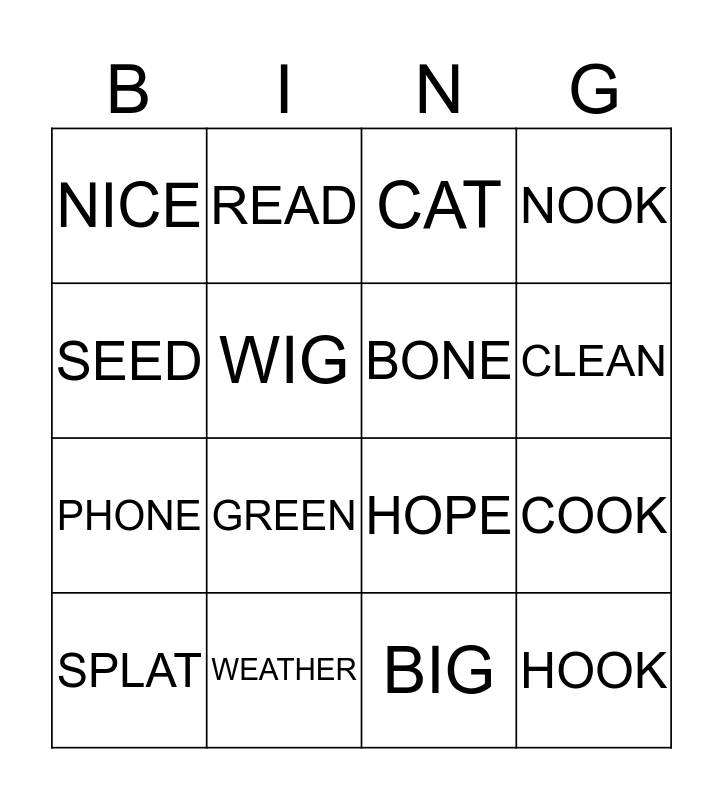 This bingo card has 16 words: WEATHER, COOK, CAT, NICE, PHONE, READ, HOPE, BIG, SEED, WIG, SPLAT, NOOK, GREEN, CLEAN, BONE and HOOK.