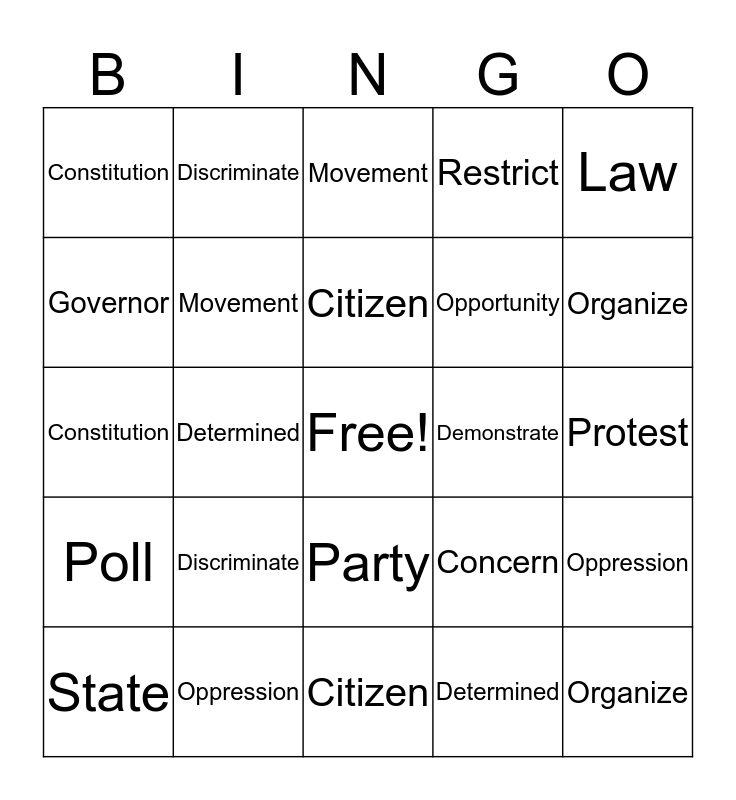 This bingo card has a free space and 41 words: Ammendment, Constitution, Right, Movement, Oppression, Party, Citizen, Opportunity, Law, Poll, Determined, Restrict, Organize, Protest, Demonstrate, Discriminate, Ammendment, Constitution, Right, Movement, Oppression, Party, Citizen, Opportunity, Law, Poll, Determined, Restrict, Organize, Protest, Demonstrate, Discriminate, State, Citizen, Concern, Governor, Enforce, Solve, Bridge Support, Improve and Contribute.