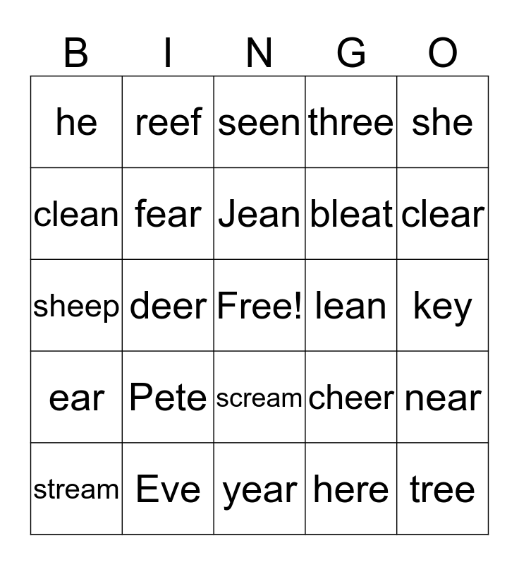 This bingo card has a free space and 24 words: Pete, Eve, Jean, stream, she, he, clean, reef, lean, scream, bleat, sheep, cheer, near, fear, here, key, seen, clear, deer, tree, ear, three and year.