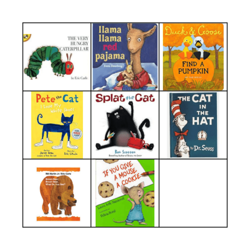 This bingo card has 7 images, a free space and 1 words: Fall Family Literacy Night.