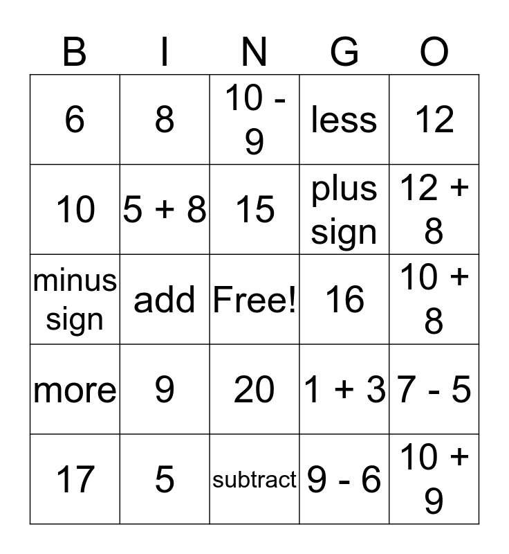 This bingo card has a free space and 24 words: 9, 5, 15, 17, 12, 6, 10, 8, 16, 20, plus sign, minus sign, 1 + 3, 7 - 5, 5 + 8, 9 - 6, 10 + 8, 10 - 9, 12 + 8, add, 10 + 9, more, less and subtract.